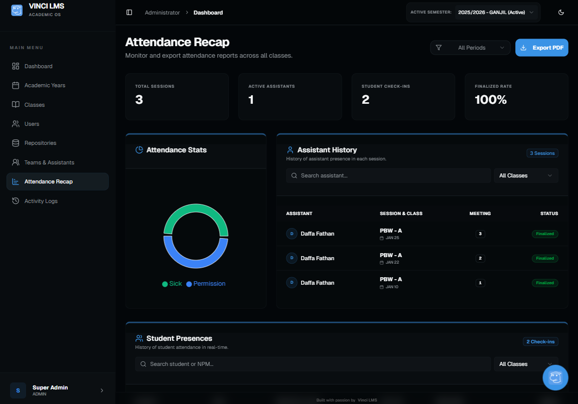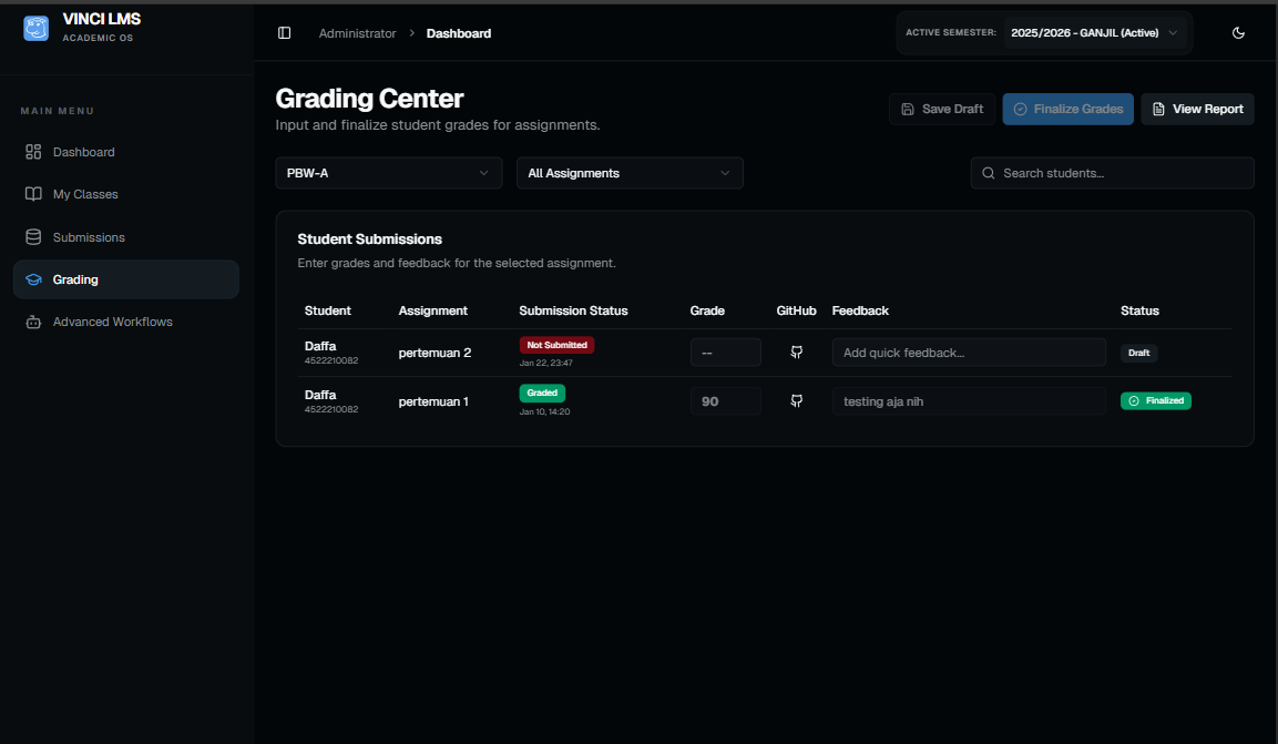 Spending hours clicking through repositories? Vinci centralizes submission monitoring and grade entry in one academic-grade UI.